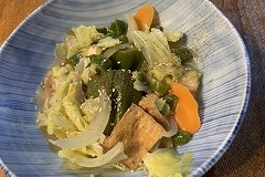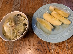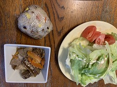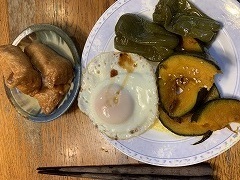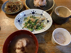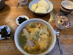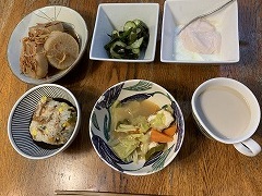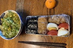 My wife made our breakfast. My wife has been making several kinds of New Year's dishes since the morning. Anko, kinpira, and namasu were already ready. We had them for lunch. My wife also made oshiruko ( anko soup with mochi). I made a vegetable and sausage soup for our evening meal. |