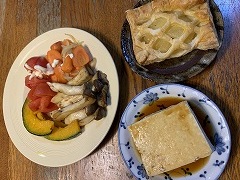 I made gyoza soup with bunashimeji and eringi mushroom, and vegetable, granola yogurt with cacao nibs, and cafe au lait for my breakfast. I made toast with cheese, ham, and vegetables for my lunch. I grilled two kinds of mushrooms, pumpkin, tomato, carrot and onion for my evening meal. I also ate the apple pie and tofu I bought at Torisen. Something feels strange on the inside of my left eyelid. I took a picture with my smartphone, but there's nothing unusual. I found Ray-Ban sunglasses lenses in the back of my desk drawer. They had been replaced with prescription sunglasses. I'll try putting it up for sale on Yahoo! Auctions. |