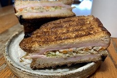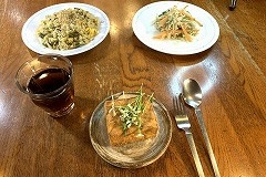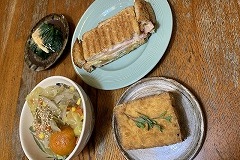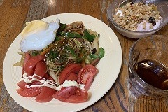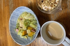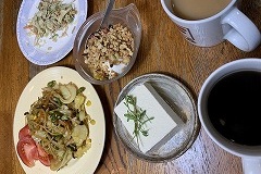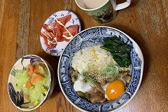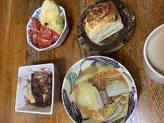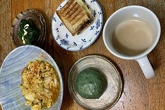 I had a rice bowl with braised pork spare ribs, boiled spinach and a raw egg for my breakfast. I also had sliced tomatoes, vegetable soup and cafe au lait.. I made a hot sandwich with ham, cheese, cucumber and Nara zuke. As usual, I left it on the kitchen windowsill to dry. I had hot sandwiches, boiled spinach, grilled Atsuage, and vegetable Harusame soup for my evening meal. The potted arugula has bloomed. Spring will soon be here. |