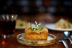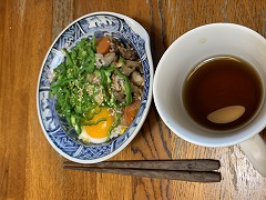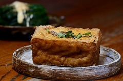 I added a raw egg to the leftover sauce yakisoba from yesterday, heated it up, and ate it for my breakfast. I also had granola yogurt, sliced tomatoes, coleslaw salad, café au lait. I made grilled atsuage, fried rice with pickled mustard greens , and coleslaw salad for my evening meal. Several flowers have bloomed on the potted arugula plant. I picked the flowers and placed them on top of the atsuage, and it looked a little prettier photogenic. So, I set up some lights and took pictures of atsage. |
