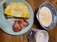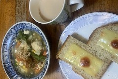 I made cheese toast and chicken meatballs and tofu vegetable soup for my breakfast. I also had cafe au lait. It started snowing this morning, but thankfully it stopped in the afternoon. |