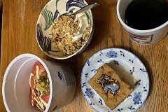 I made two servings of sauce yakisoba with lots of vegetables, one for my breakfast, other for my evening meal. I made vegetable soup soba for my lunch. I made a stir-fry of daikon radish and bonito flakes seasoned with soy sauce for my evening meal. I also ate kakiage (vegetable tempura) and sauce yakisoba. I baked graham bread in my electric automatic bread maker. I set the timer so it would be ready at 5 o'clock. I'm selling an aluminum pot, a French Army surplus item that I used to use for outdoor cooking, on Yahoo! Auctions. I won't be using it outdoors anymore. Its shape makes it inconvenient for indoor use. |