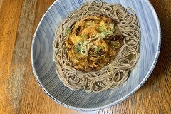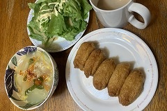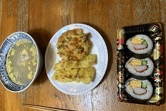 I made a soup with pumpkin, vegetables, and soba for my breakfast. I went to visit my cousin who is battling an illness. I had been a while since I'd seen him. Shuroku is next to Torisen. This former sake brewery has now been renovated into a complex that includes a multipurpose hall and a cultural, historical, and tourist information center. I'd never really looked inside before, so I decided to explore. There was a glassblowing workshop. Craftsman was working. A sake brewery had been converted into a hall. There was a group doing jazz dance. I took a few photos. The structure of the sake brewery could be used as a background for something. Next time, I'll try bringing a subject to photograph. I had squid tempura, kakiage, and norimaki sushi that I bought at Torisen for my evening meal. |